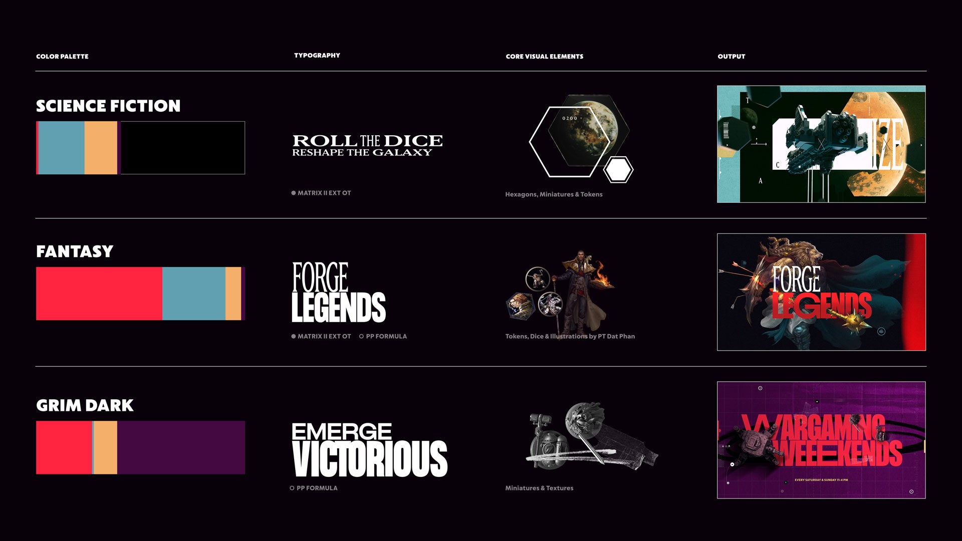 Rather than creating one universal rebrand, the approach recognizes that different tabletop genres have distinct communities with their own visual expectations. The system creates genre-specific expressions while maintaining the core competitive spirit across all applications.